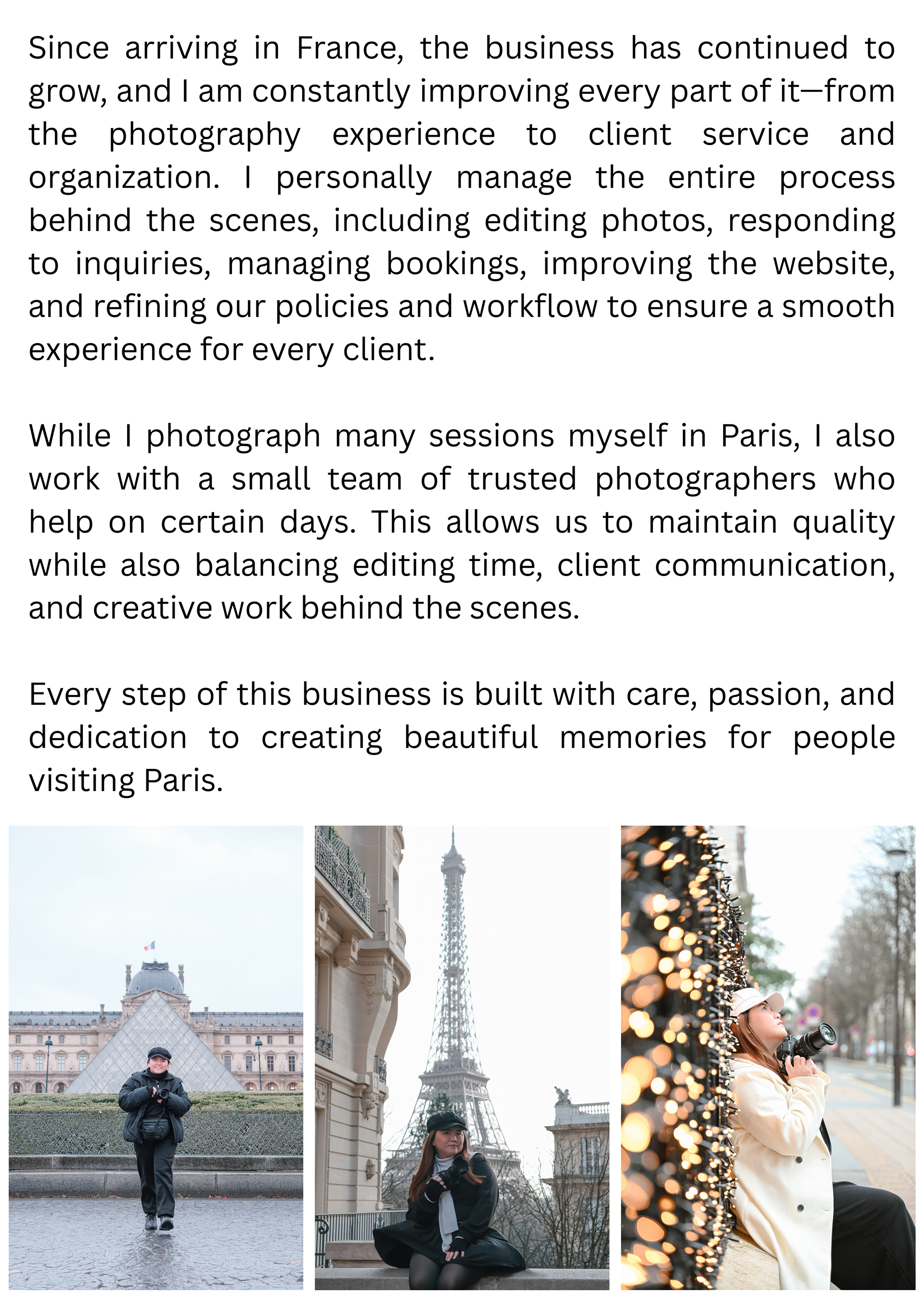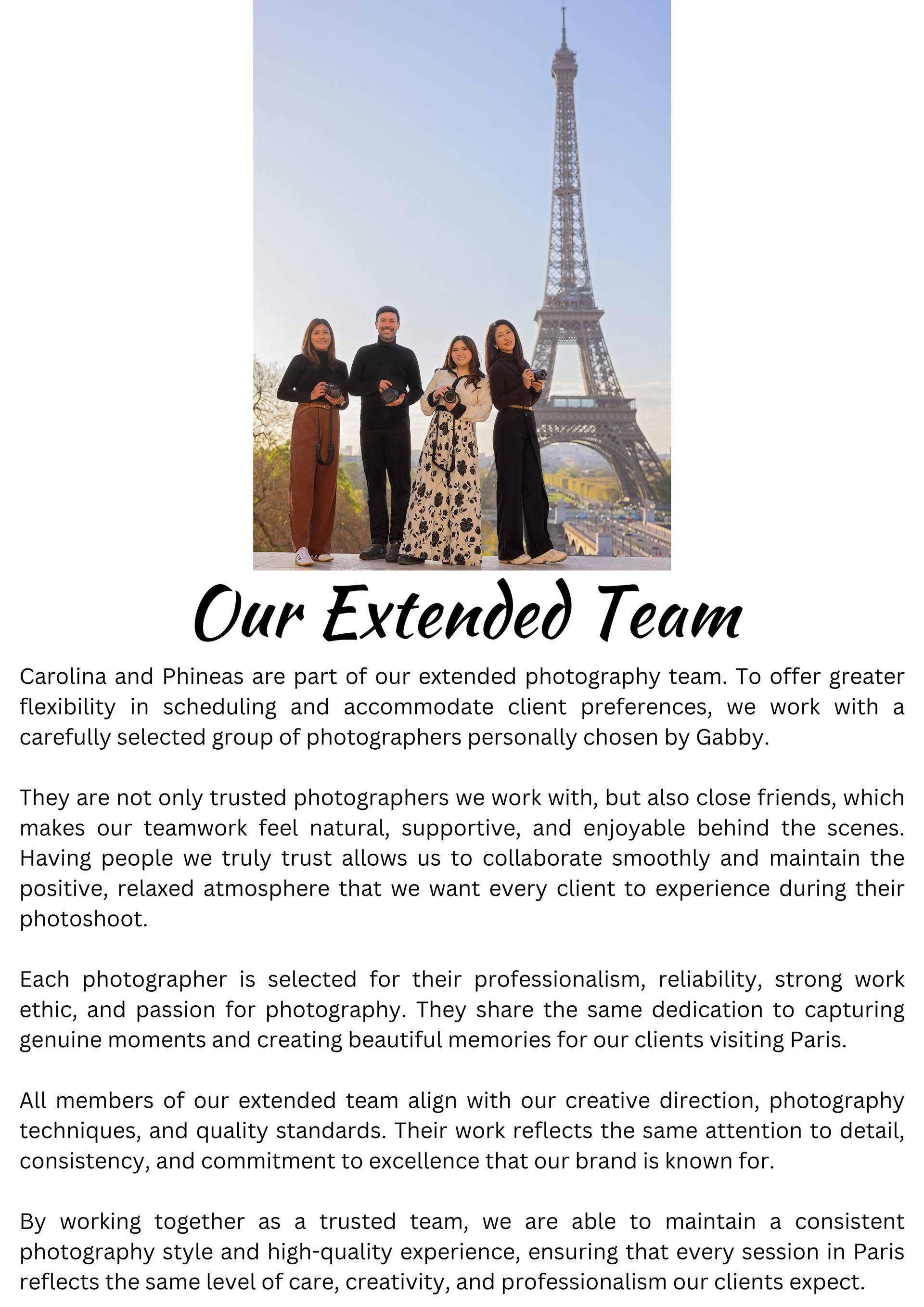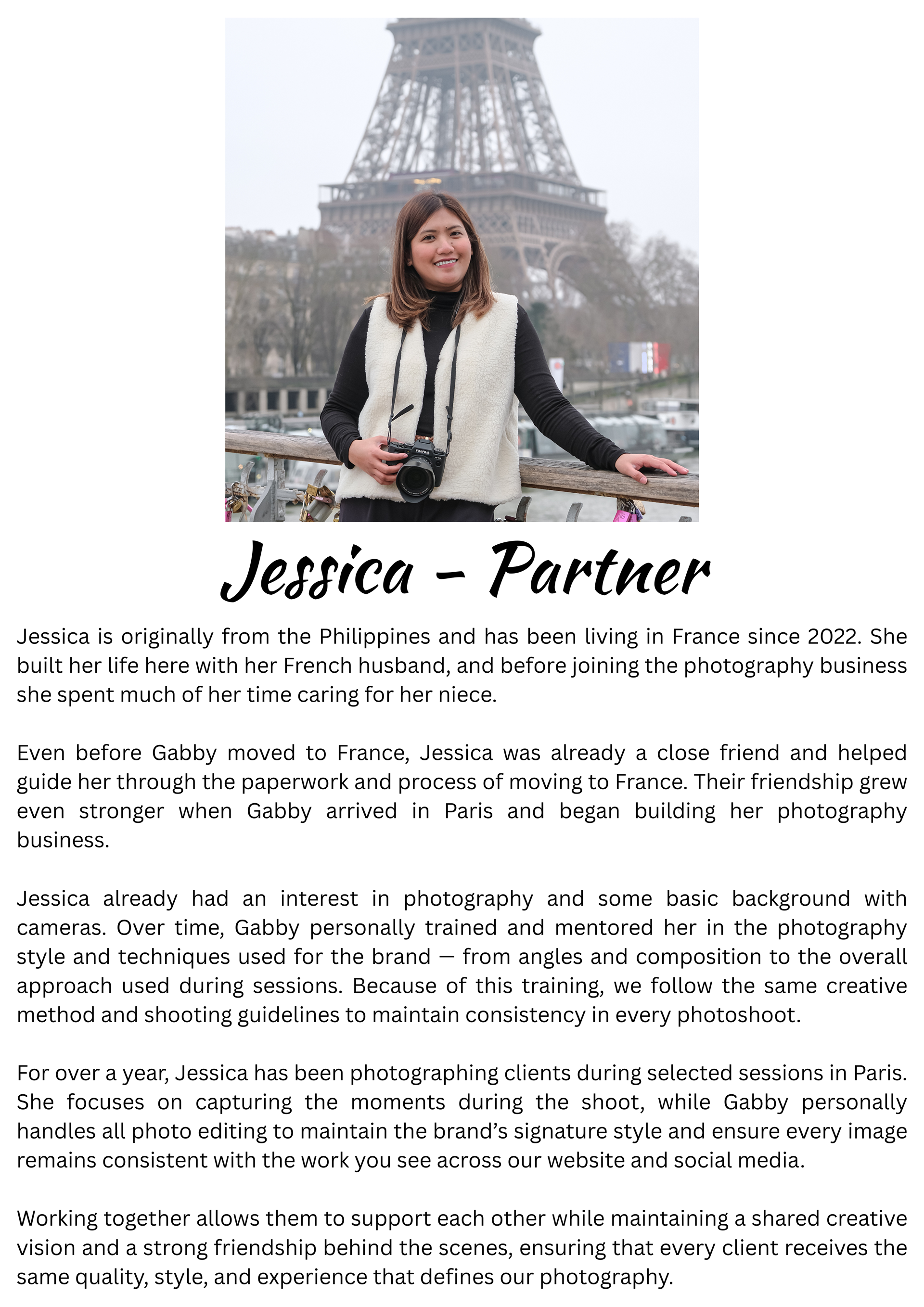 Meet the people behind our Paris photography — from Gabby’s journey and creative vision to the talented team who help bring each photoshoot to life, including Jessica, Carolina, and Phineas, who all play a part in creating beautiful memories for our clients.