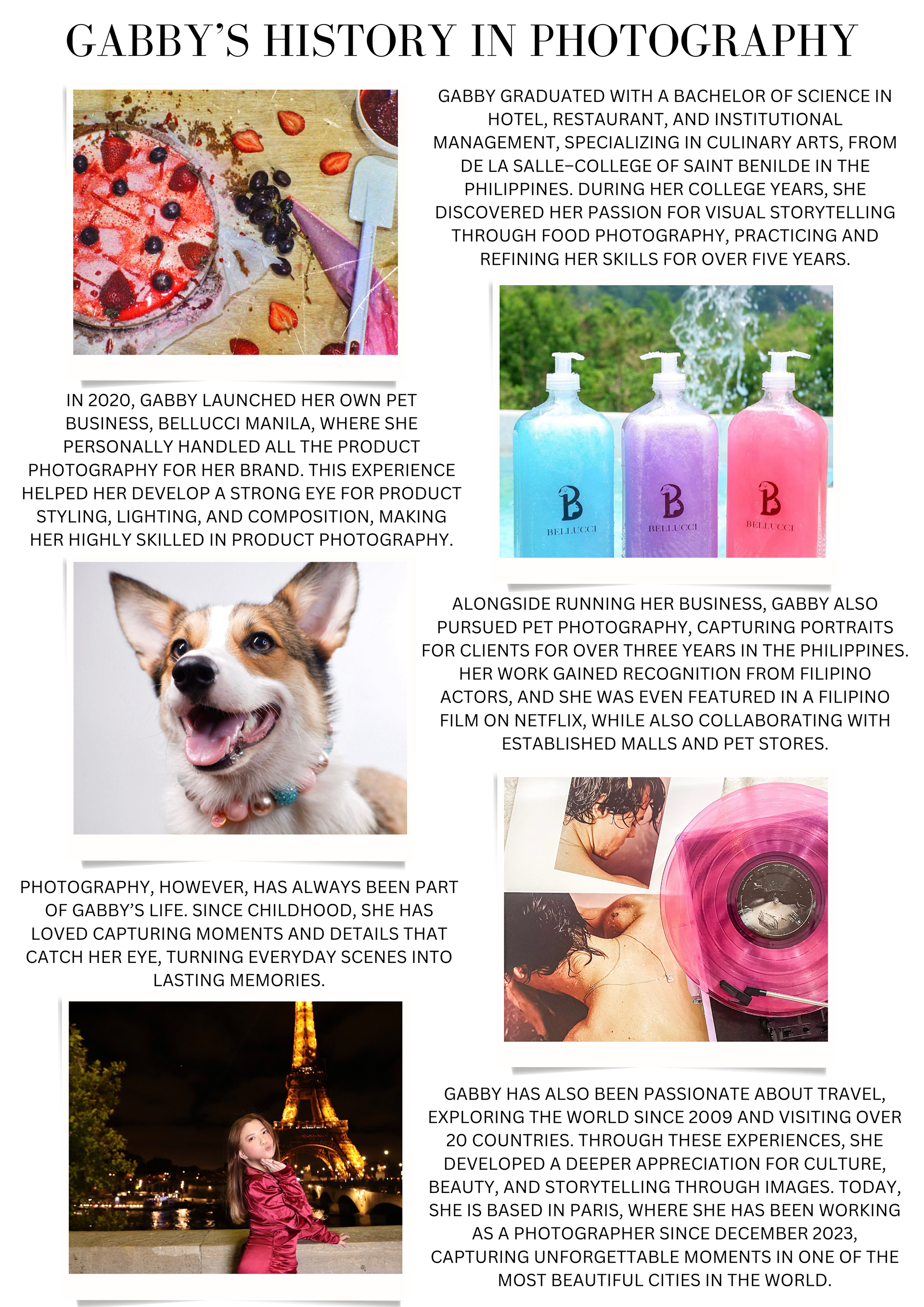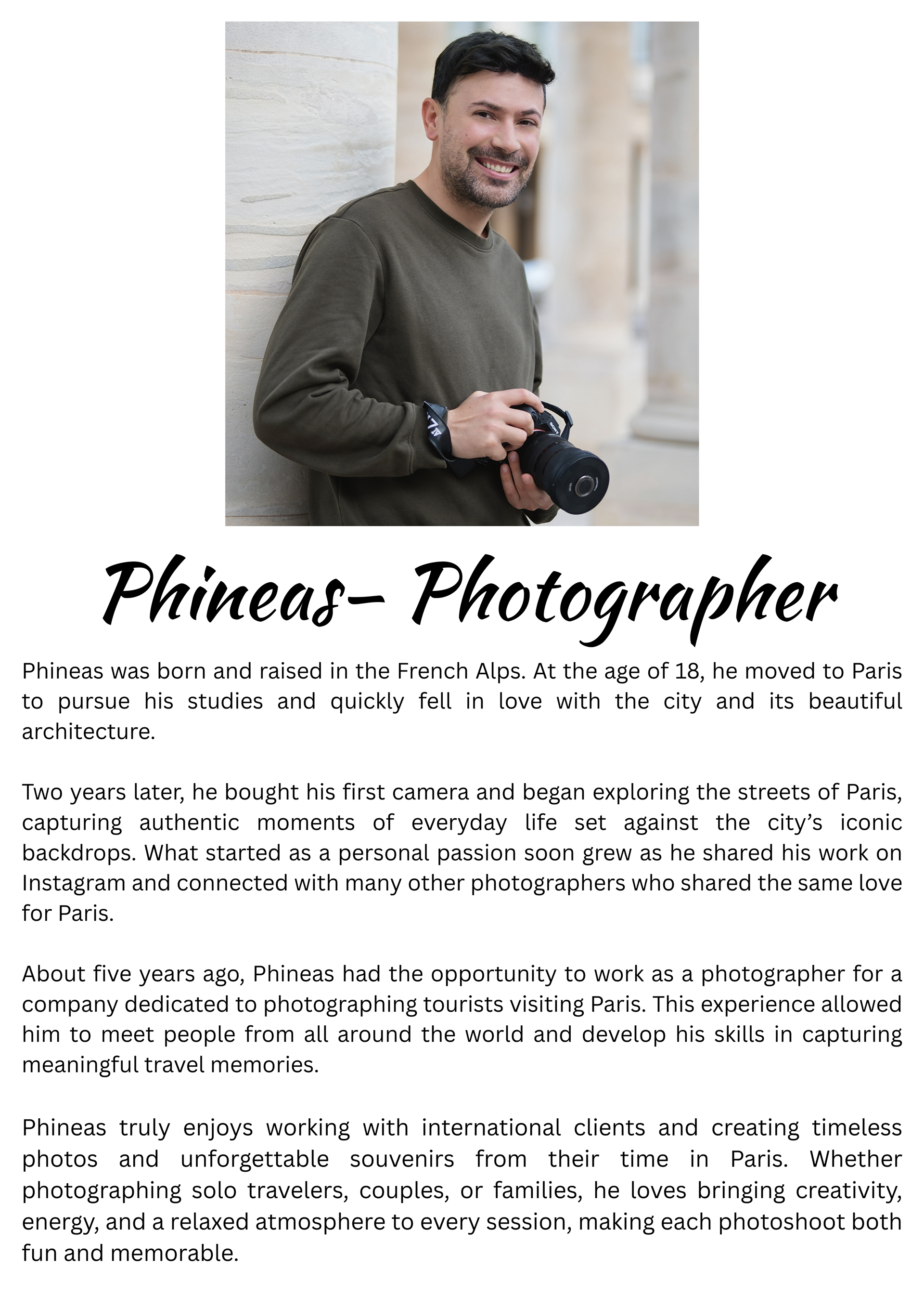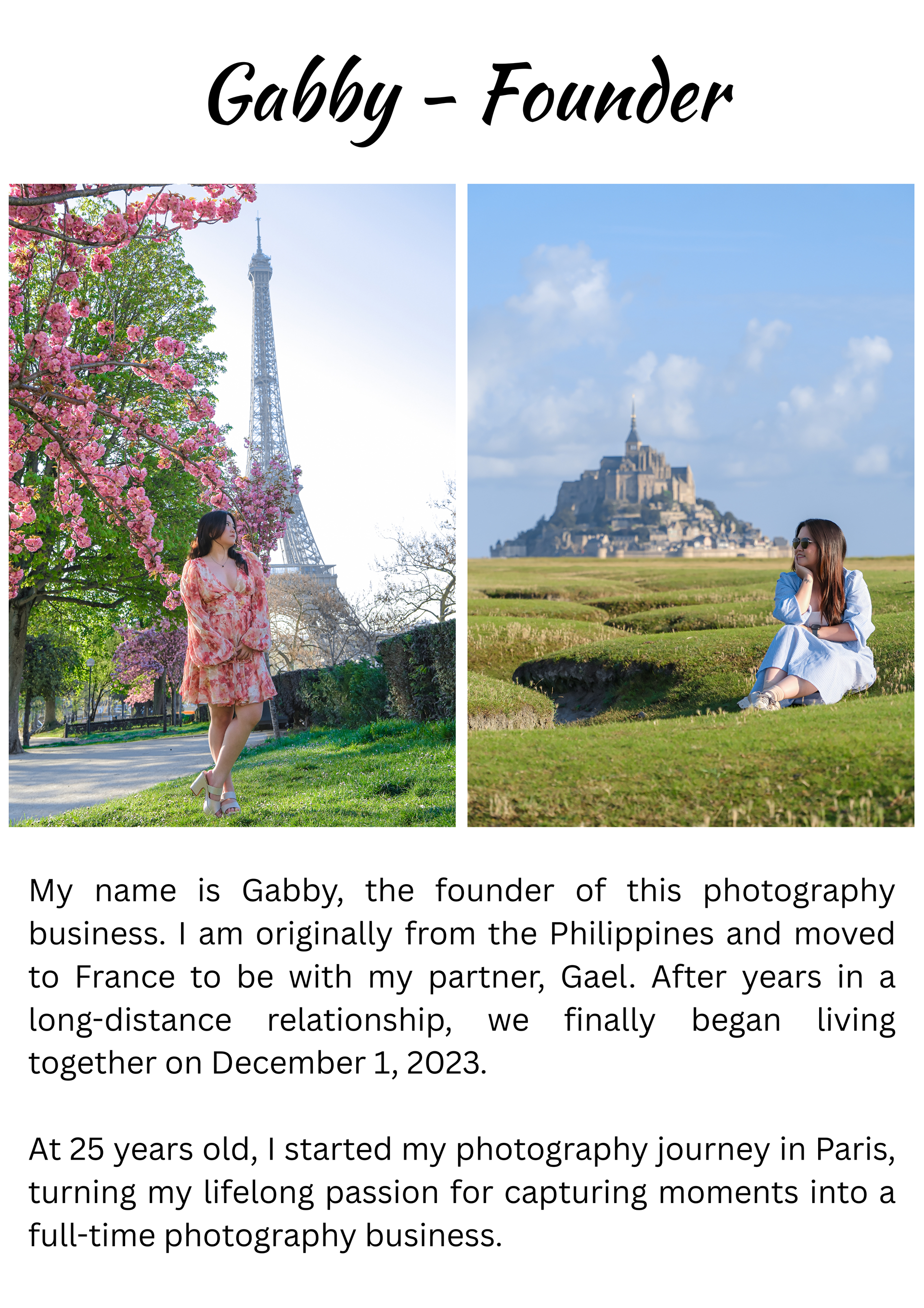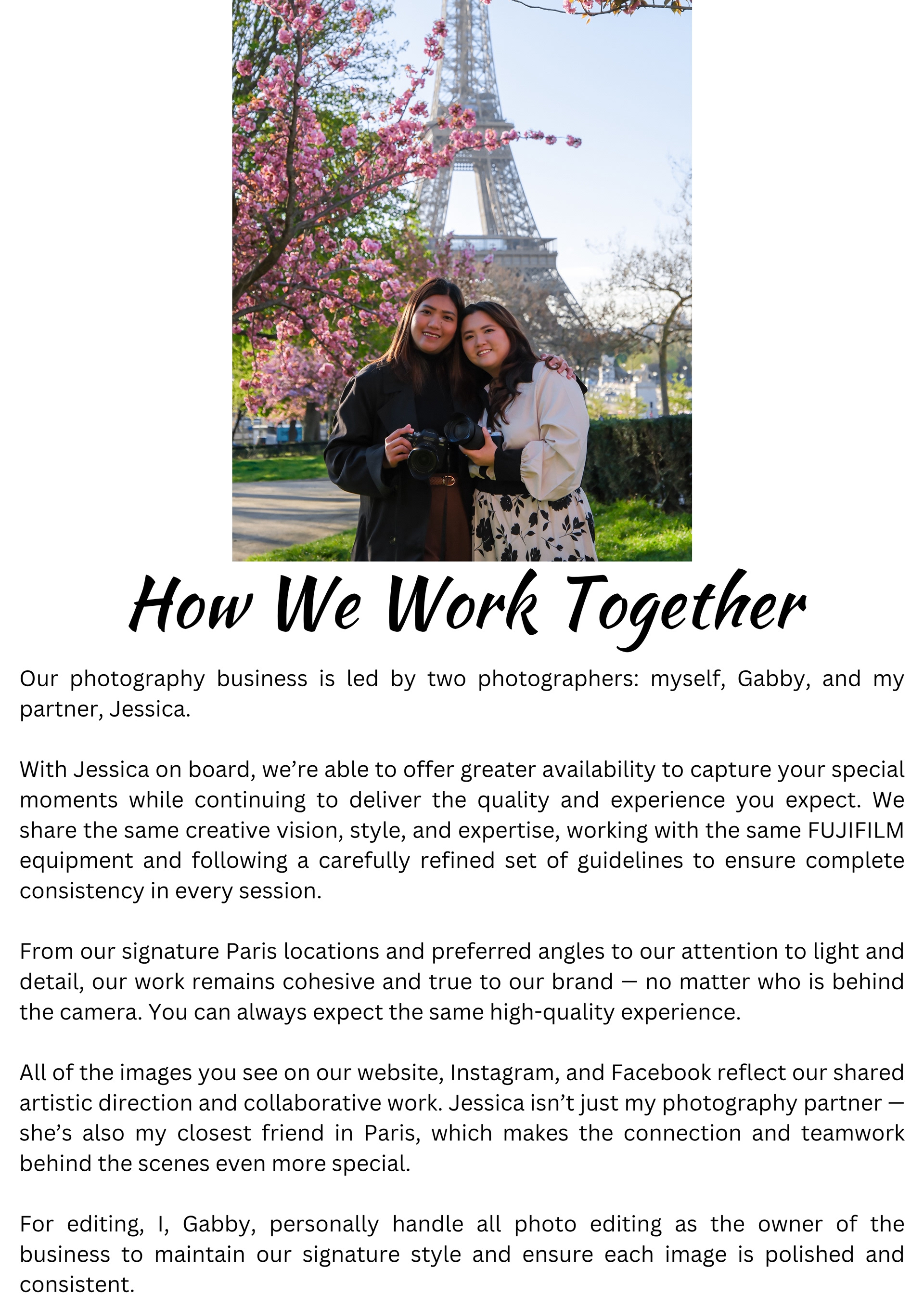 Meet the people behind our Paris photography — from Gabby’s journey and creative vision to the talented team who help bring each photoshoot to life, including Jessica, Carolina, and Phineas, who all play a part in creating beautiful memories for our clients.