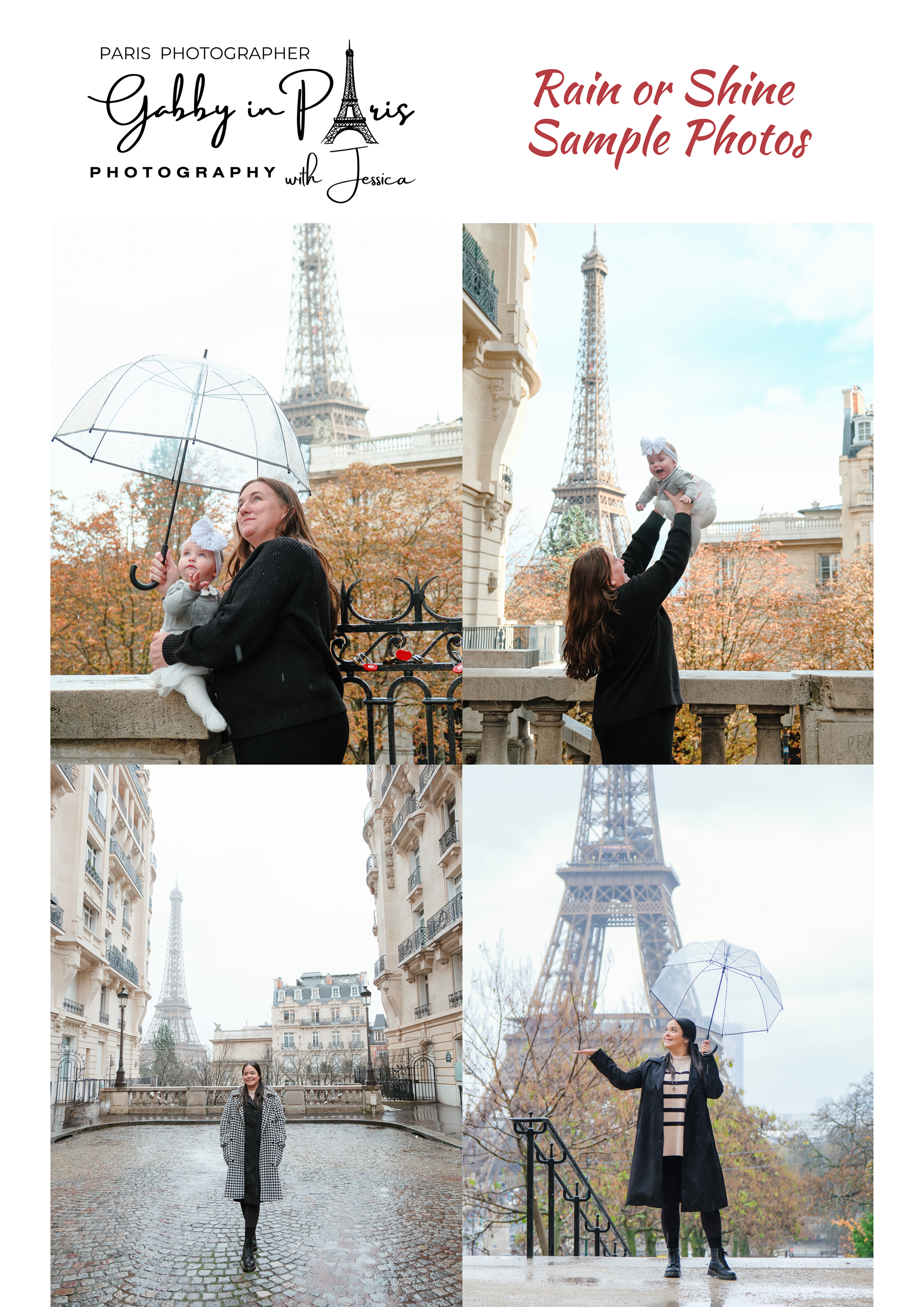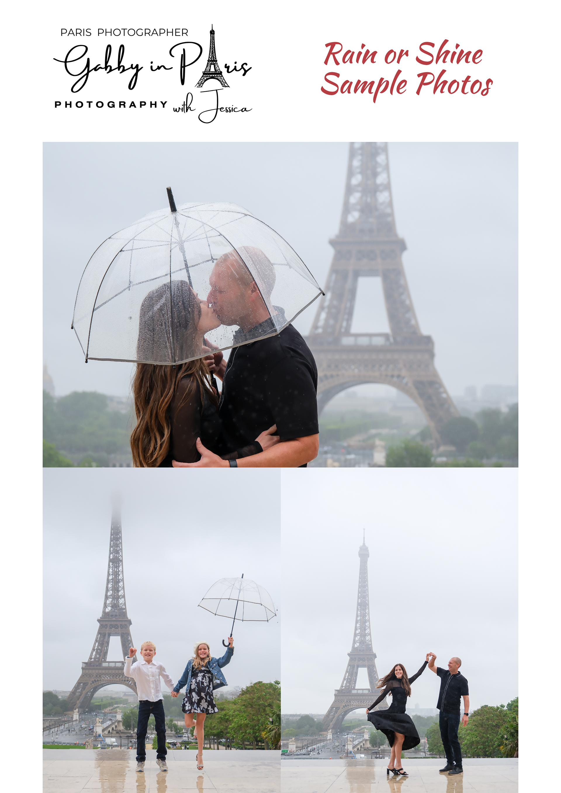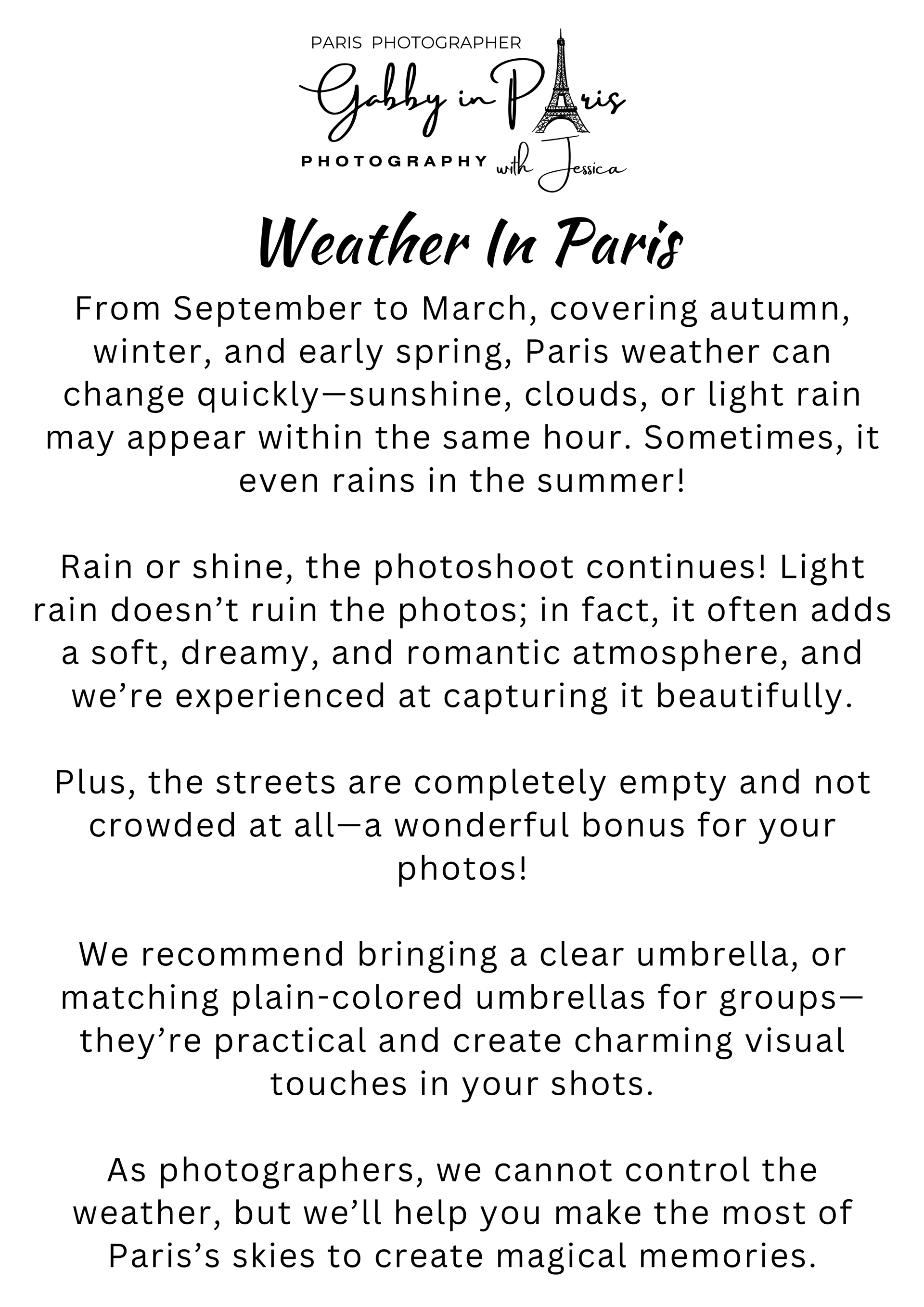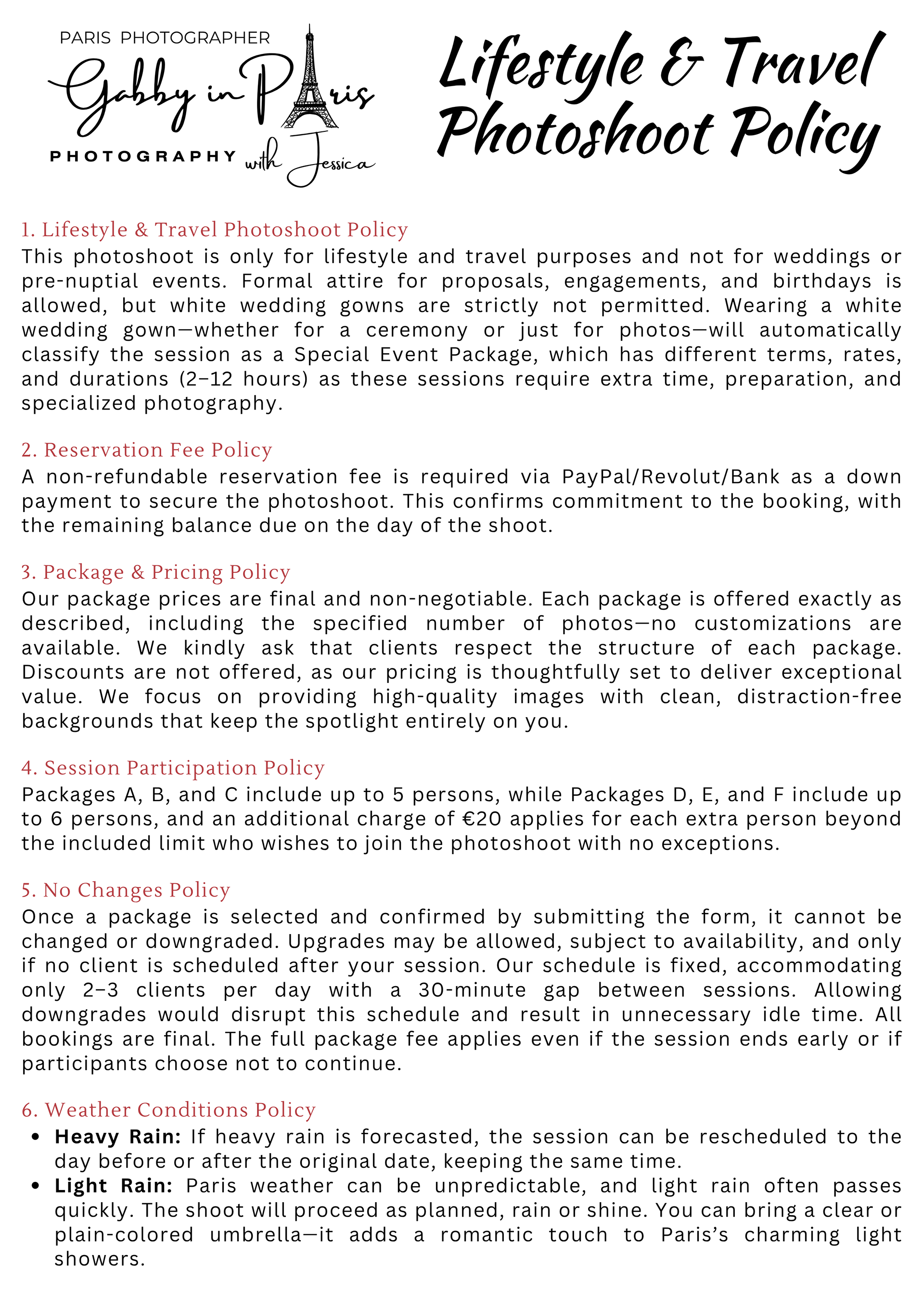 On this page, you can read about the "Photographer’s Copyright" information. We also have "two (2) separate sets of Photoshoot Policies and Terms and Conditions" for our photoshoot services: first is the "Lifestyle and Travel Photography" for tourists, and second is the "Special Event Photography" for weddings and other events. Below, you can also find "Weather in Paris" information, especially during rainy days, along with some sample photos.
