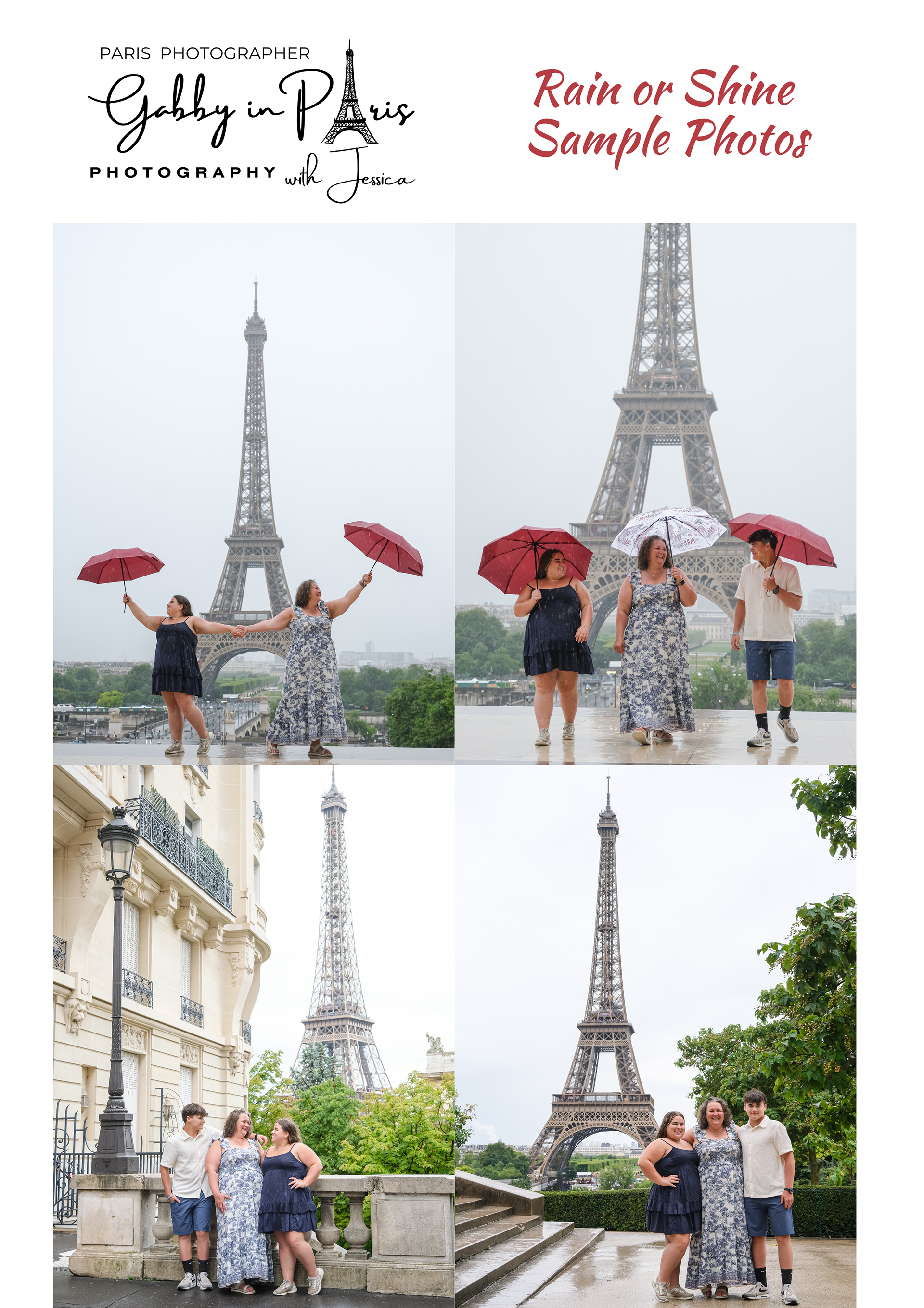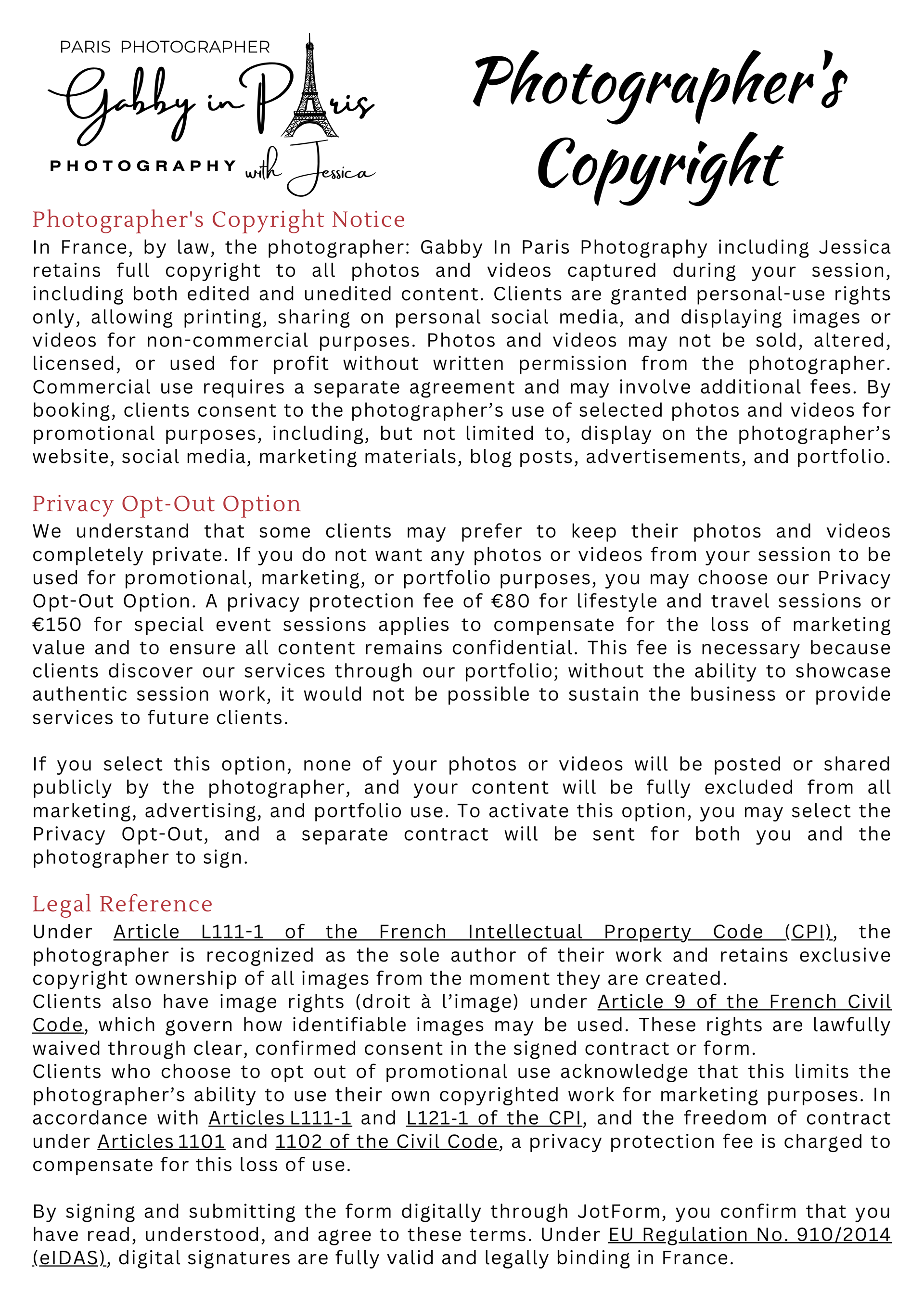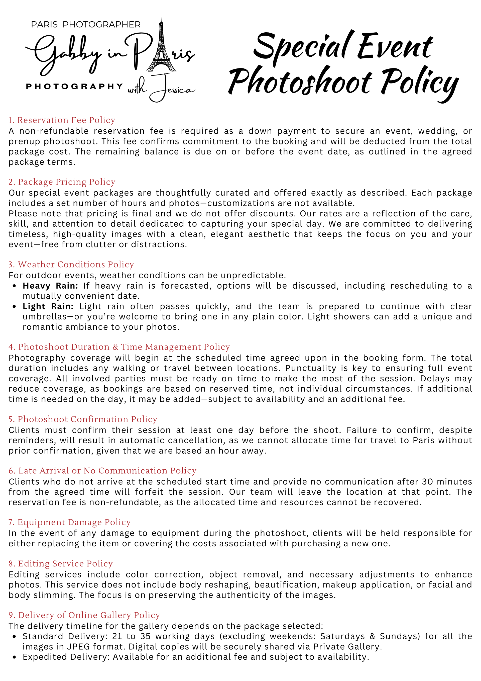 On this page, you can read about the "Photographer’s Copyright" information. We also have "two (2) separate sets of Photoshoot Policies and Terms and Conditions" for our photoshoot services: first is the "Lifestyle and Travel Photography" for tourists, and second is the "Special Event Photography" for weddings and other events. Below, you can also find "Weather in Paris" information, especially during rainy days, along with some sample photos.