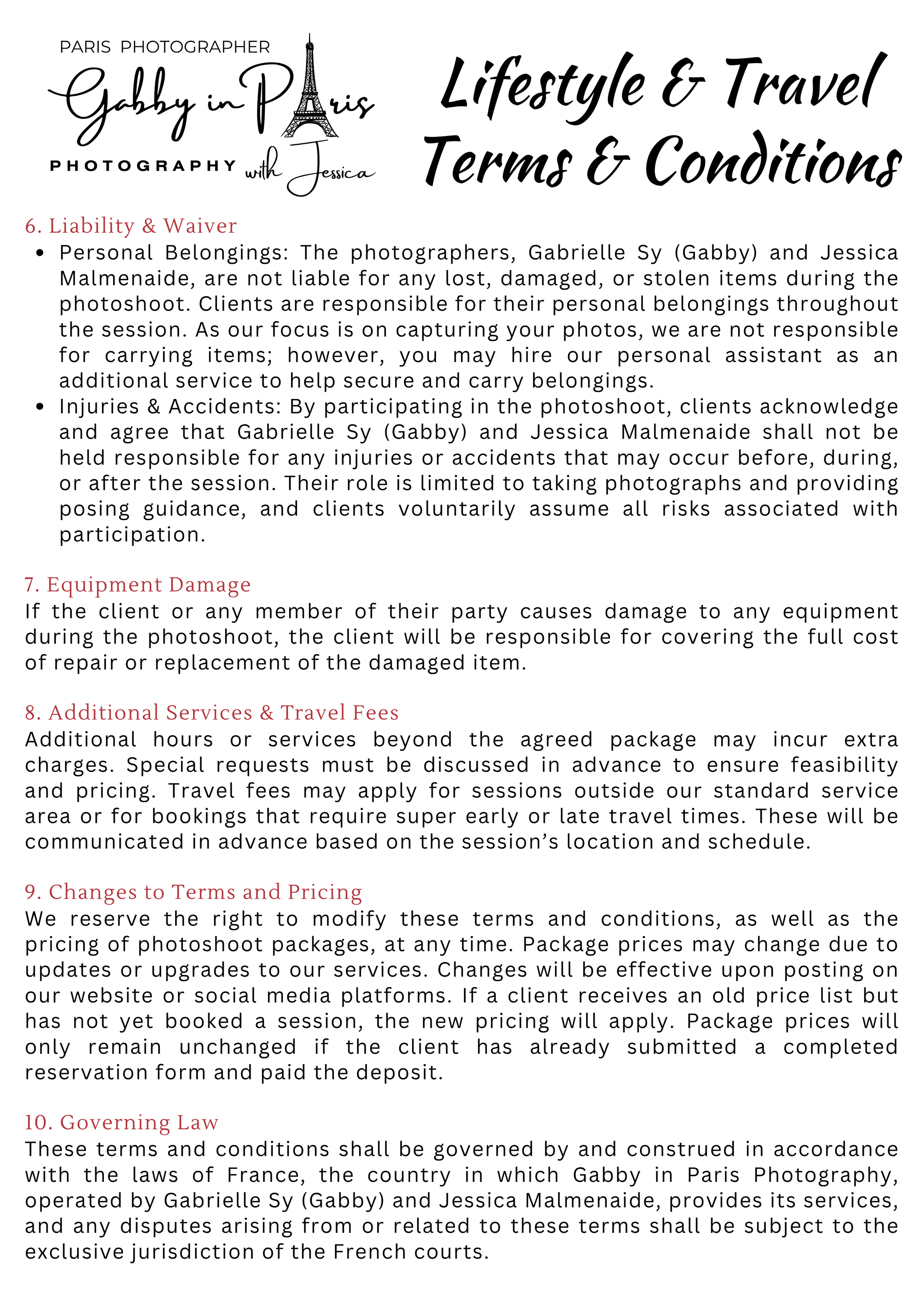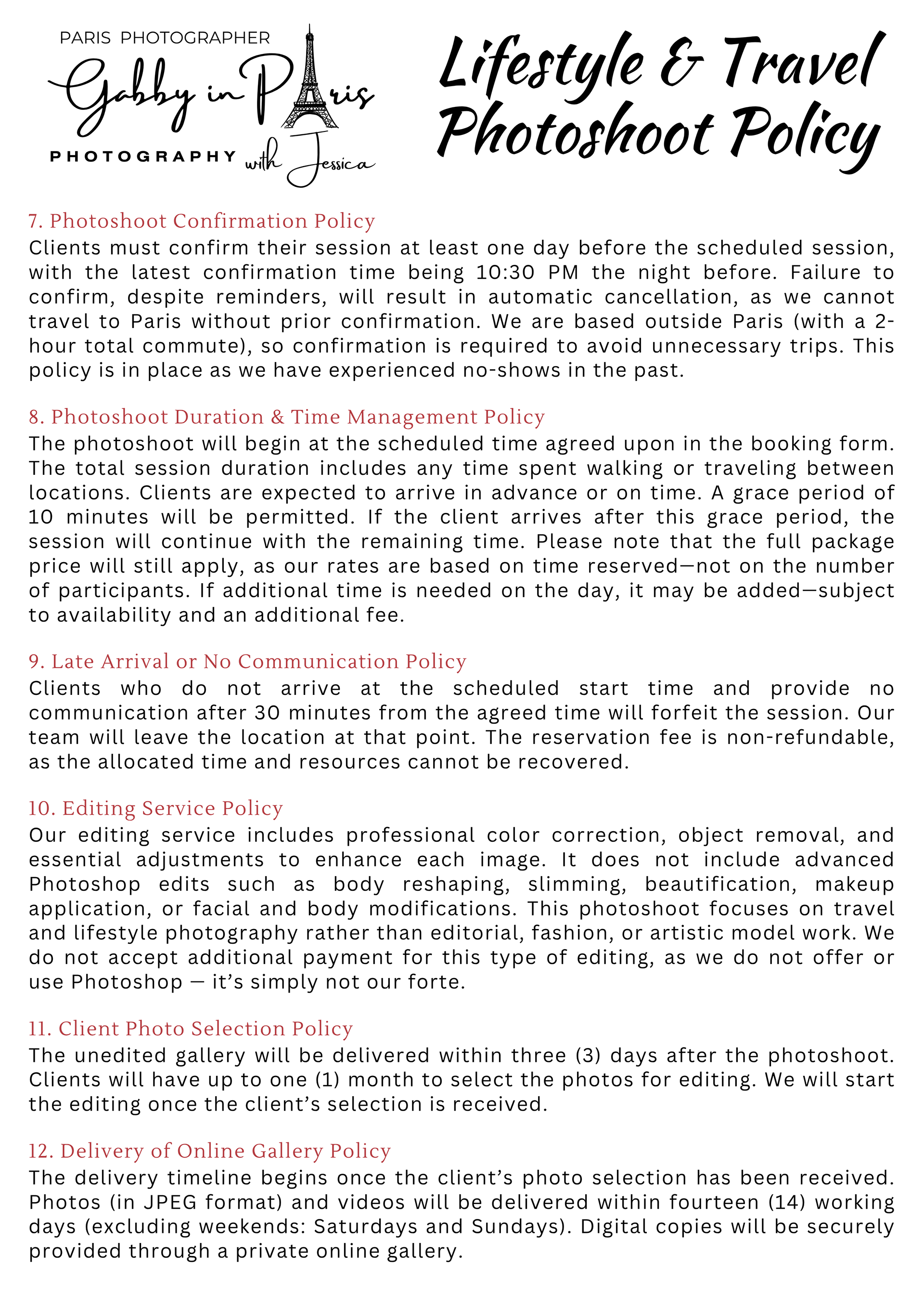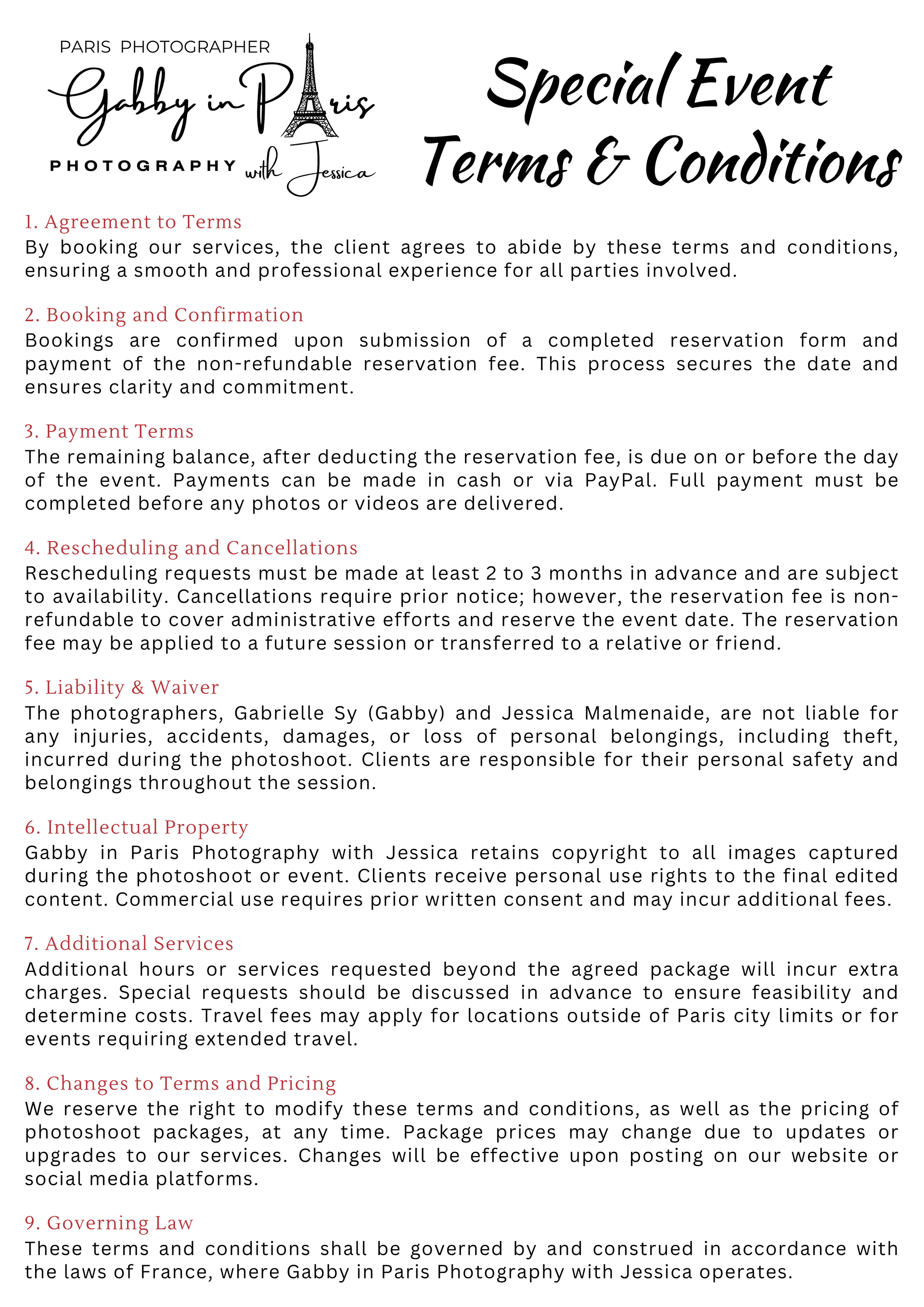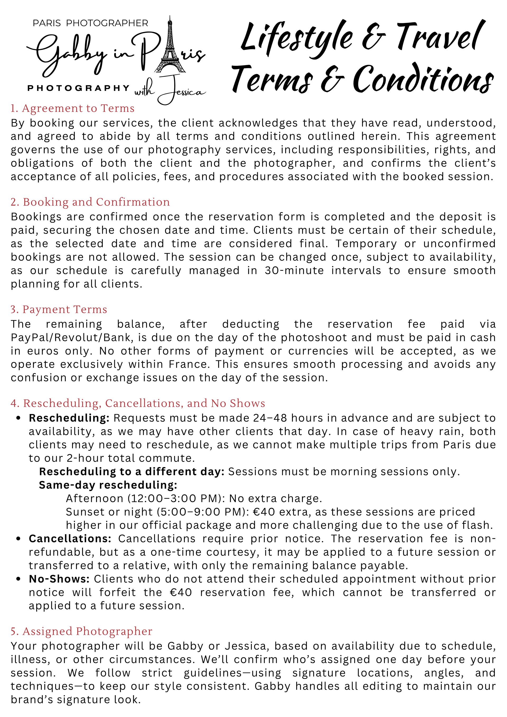 On this page, you can read about the "Photographer’s Copyright" information. We also have "two (2) separate sets of Photoshoot Policies and Terms and Conditions" for our photoshoot services: first is the "Lifestyle and Travel Photography" for tourists, and second is the "Special Event Photography" for weddings and other events. Below, you can also find "Weather in Paris" information, especially during rainy days, along with some sample photos.